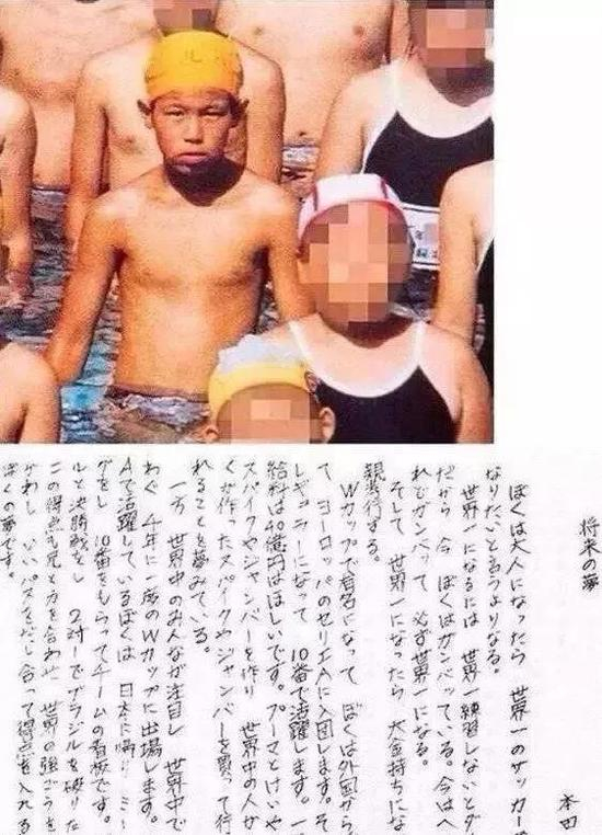 本田写过一篇著名的日记,关于梦想的。那时他还在上小学,他说:“我要披着10号球衣驰骋在意甲赛场上,成为世界杯上的明星,变成世界第一的球员,带领日本男足在世界杯决赛击败巴西队拿到冠军。而在这之后,我就会有很多很多的钱,并用这些钱来孝顺爷爷奶奶。”