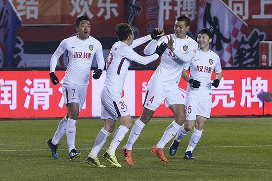 2018中超第27轮,贵州恒丰智诚Vs广州恒大淘宝。张成林、郜林庆祝进球。