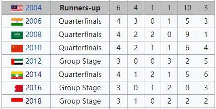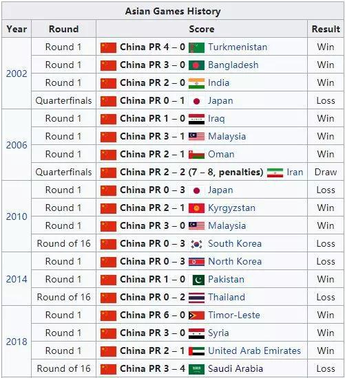 亚运会上,中国队也连续五届止步淘汰赛首轮。2006年点球大战不敌伊朗,2010年0-3韩国,2014年0-2泰国,2018年3-4沙特。