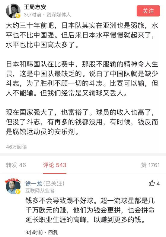日本球迷还结合国足比赛结果,对中超的高薪及大牌外援所能起到的作用表示了怀疑。甚至有球迷提出了和王志安类似的观点,“中国的选手只待在家里赚钞票,已经丧失了饥饿感。”