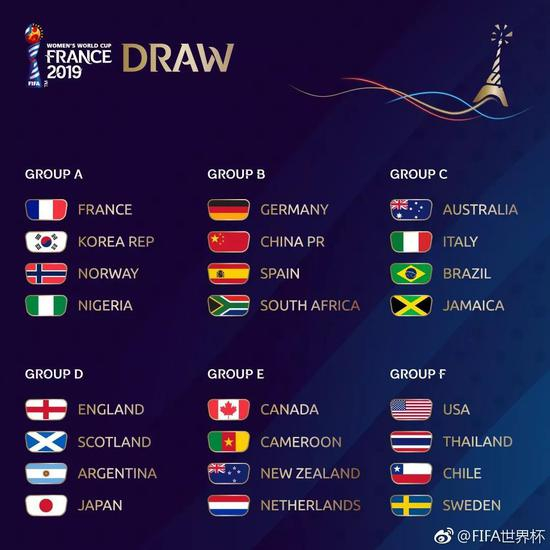 2019年女足世界杯将在今年6月7日到7日7日间在法国进行,中国队将在6月8日、13日、17日先后与德国、南非、西班牙交锋,小组赛前两名与四个成绩最好的第三名将会进入到十六强。