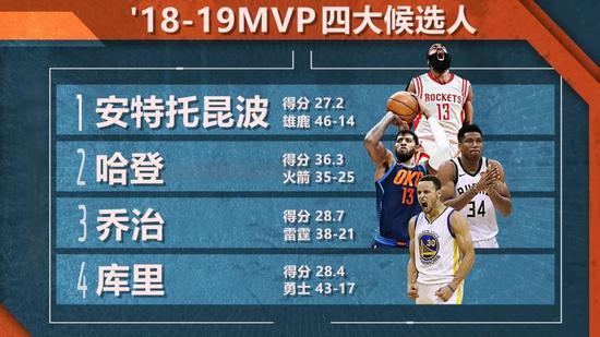 约基奇、莱昂纳德和杜兰特同样有竞争的机会,但我个人认为:MVP最终将是“字母”与哈登之间的竞争,乔治是黑马,库里则会受累于超强的阵容。