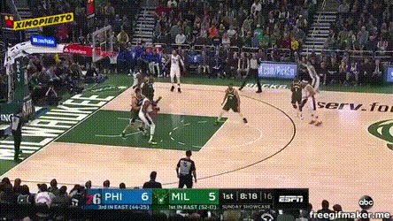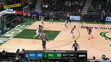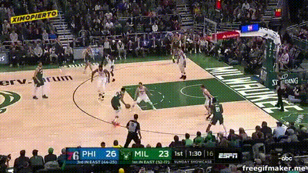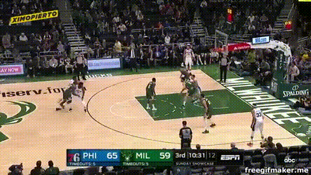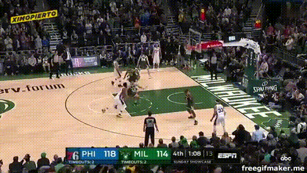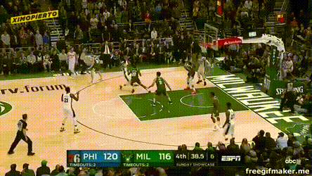 比赛末尾,雄鹿一度靠扬尼斯和米德尔顿追回点分差,然后费城用这么两个球锁定胜局: