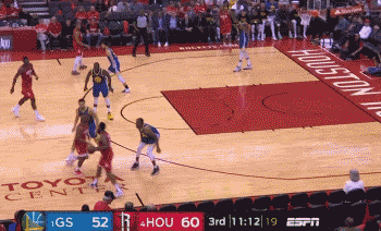 除了进攻低迷之外,汤普森上半场防哈登也不成功。在第三节刚刚开始漏了哈登这次突破之后,科尔改用伊戈达拉在下半场主防——