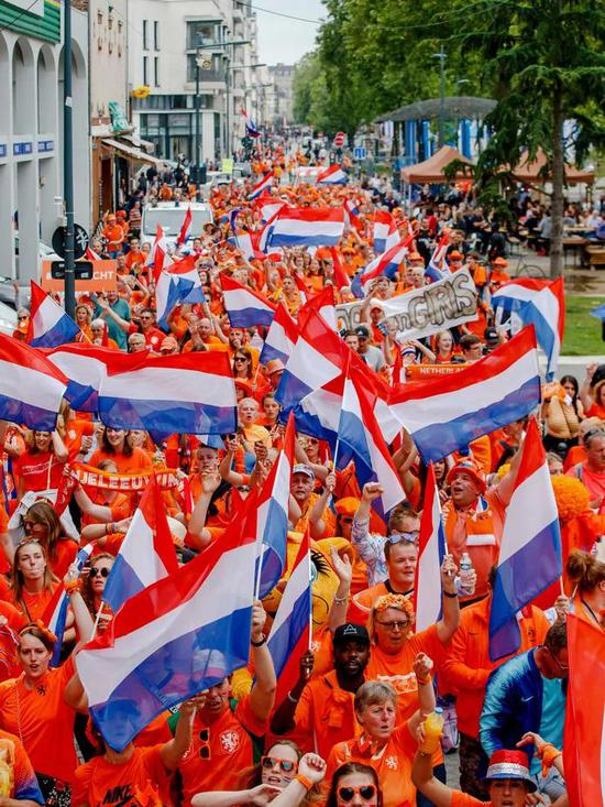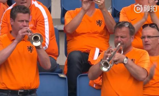 荷兰球迷的应援相当认真,除了标配的橙色衣服外,他们还会再选另一件橙色物品,大到充气玩偶,小到帽子、头饰,就连喝的饮料都会首选芬达。荷兰队员入场后,球迷大声呼喊她们的名字,其中有几位大叔,每场比赛,他们都会带着小号在看台上表演。当荷兰队局面被动时,大叔们开始吹奏皇后乐队的《 We Will Rock You》,进攻稍有起色后,他们又将歌单切换到《友谊地久天长》,示意“友谊第一”。