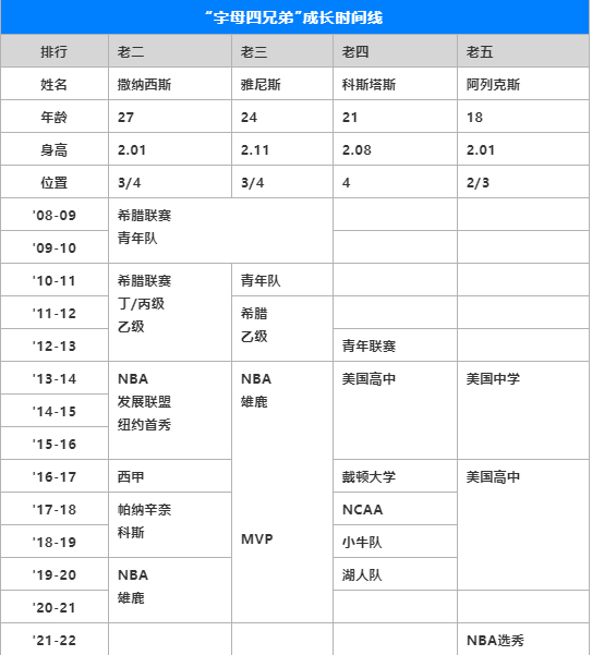 虽然排行第三,但“字母”才是家里的顶梁柱。他让雄鹿队签下了二哥撒纳西斯,四弟科斯塔斯虽然被小牛队裁了,但今天也从湖人队拿到了双向合同。最受三哥庇护的是老五阿列克斯,很可能在两年后的2021年夏天参加NBA选秀,并且是首轮中选。