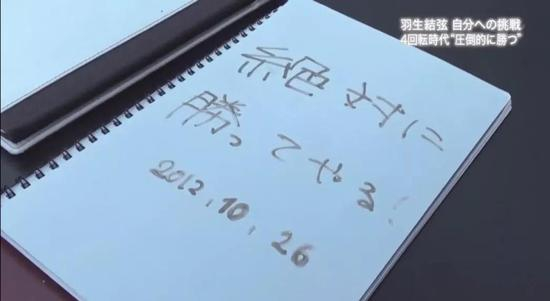 他从青年组比赛时开始写滑冰笔记,会把训练中的问题,改进的方向,比赛感想都写在笔记本上,当然也包括对胜利的欲望。当状态出现起伏,他会翻到2012年时写下的四个金色大字,“绝对要赢”,随后状态就会有所提升。在2012年10月的一场比赛中,羽生结弦在短节目中排名第一,但自由滑中被逆转,最终获得银牌,于是抱着“拿了第二名,气死了”的心情写下了这句话。