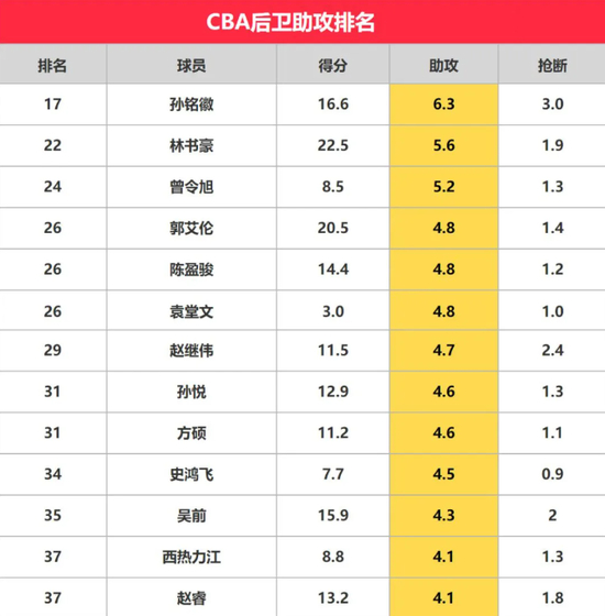 防守恰好是孙铭徽的特长。这个赛季他已经有7场球的抢断数达到5+,在助攻排名靠前的本土后卫中,他平均抢断3次,高居第一位,接下来是赵继伟和赵睿。